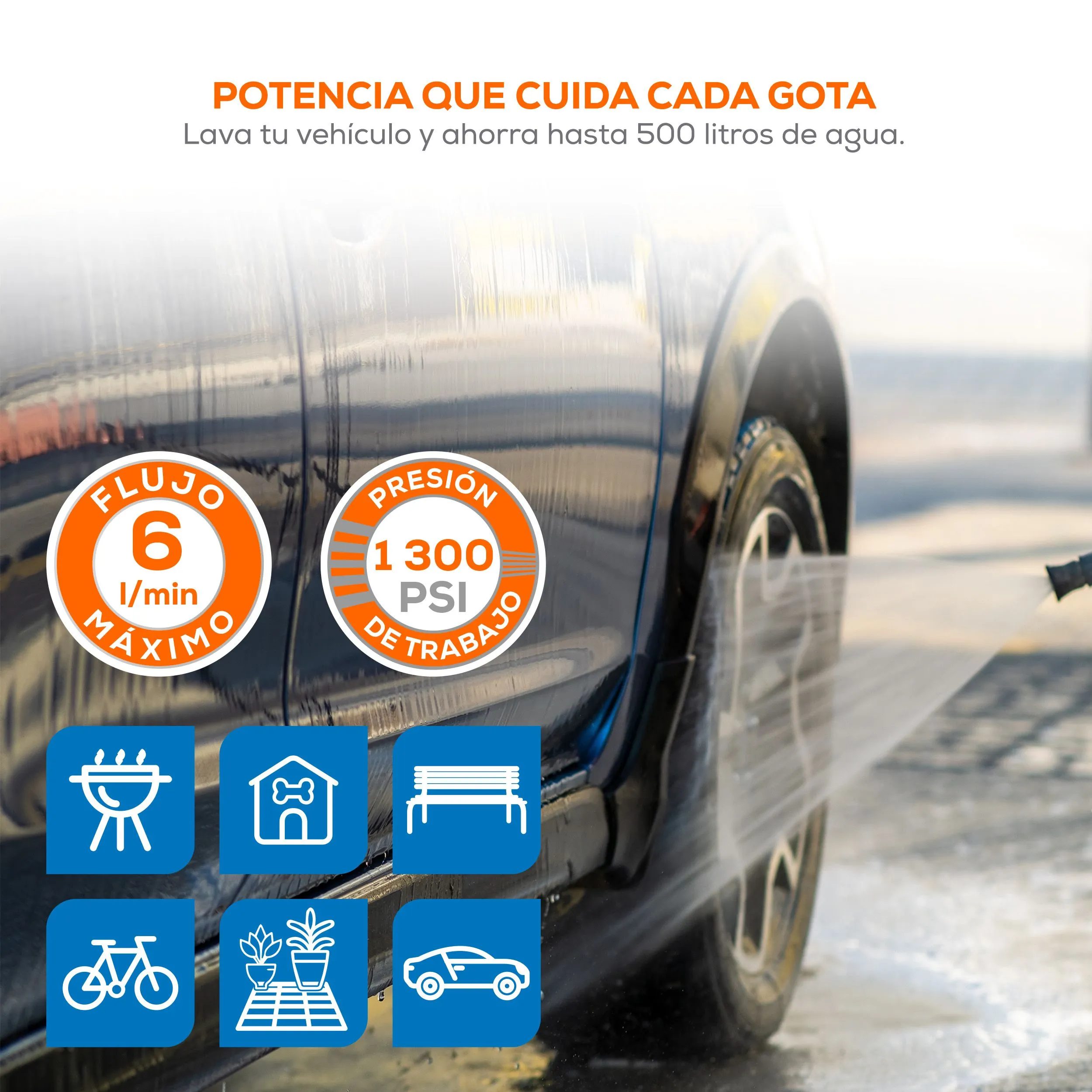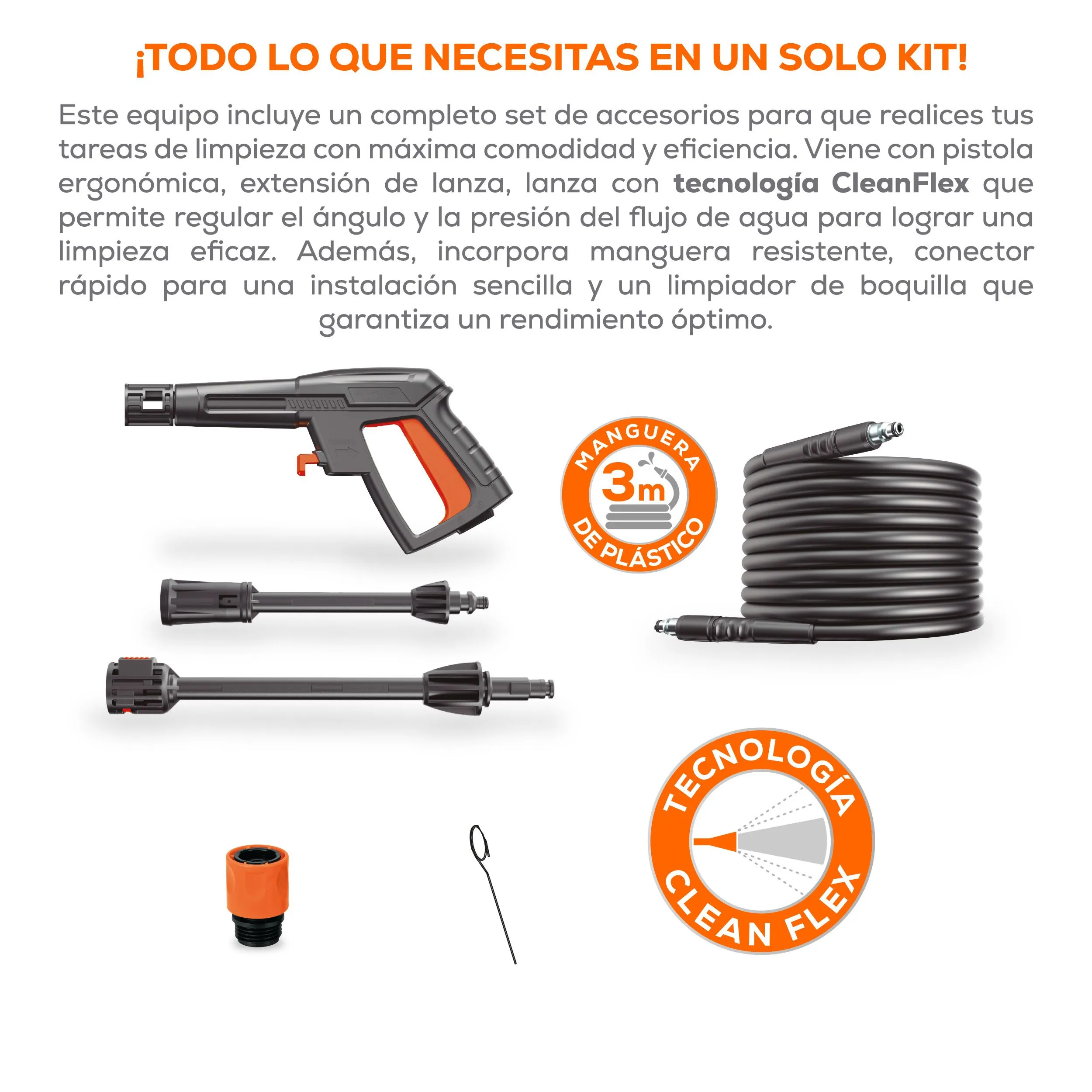 | Accesorios | • Pistola. • Lanza con boquilla variable. • Lanza con boquilla turbo. • Manguera (3m) • Conector rápido de manguera 3/4″” |